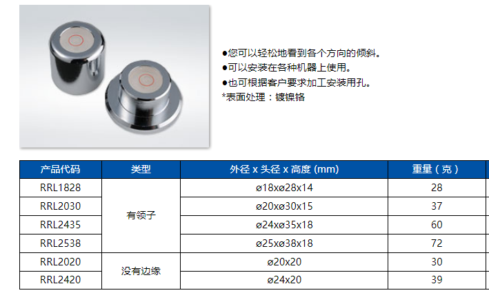 您可以輕松地看到各個(gè)方向的傾斜,可以安裝在各種機(jī)器上使用。也可根據(jù)客戶要求加工安裝用孔。表面處理:鍍鎳鉻