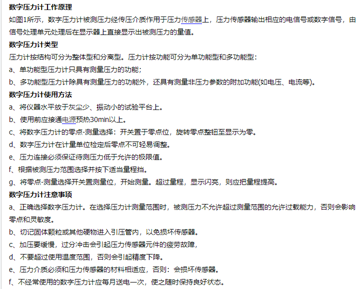 a、正確選擇數(shù)字壓力計(jì)。在選擇壓力計(jì)測量范圍時(shí),被測壓力不允許超過測量范圍的允許過載能力,否則會(huì)影響零點(diǎn)和靈敏度。