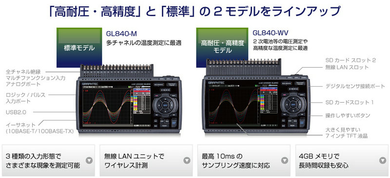 日本圖技全新推出GL820記錄儀的升級(jí)產(chǎn)品GL840系列,日本圖技存儲(chǔ)記錄儀GL840分為兩個(gè)型號(hào)分別是GL840-M和GL840-WV。兩個(gè)型號(hào)的主要區(qū)別是輸入電壓和測(cè)試精度不一樣。詳情可咨詢上海增駿。全新GL840記錄儀測(cè)試電壓范圍更大,全部可以直接連接GL100的傳感器,存儲(chǔ)采用外接SD卡存儲(chǔ),最大可支持32G。存儲(chǔ)記錄儀GL840全部支持無(wú)線通訊,可以直接和GL100進(jìn)行無(wú)線通訊。GL840顯示屏幕增加到7英寸。