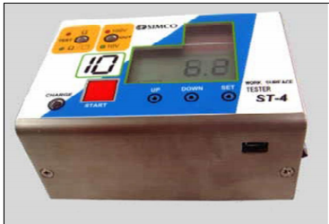 SIMCO表面電阻測(cè)試儀ST-4是操作簡(jiǎn)單的便攜式表面電阻測(cè)試儀。僅需放置在測(cè)量對(duì)象上,即 可測(cè)量表面電阻。由于內(nèi)置著定時(shí)器,所以不會(huì)因忘記切斷電源而降低電池容量。此外,將 附屬電源線插入主機(jī)右側(cè)的插座中,將附屬電源線的末端連接至接地體,能夠測(cè)量放置著主 機(jī)的導(dǎo)電墊等的表面與其接地端子間的總電阻(接地漏電阻)。 測(cè)量范圍大,可達(dá)103~1013Ω/□(或Ω),能夠測(cè)量各種材料和產(chǎn)品的電阻。 尤其適用于導(dǎo)電墊、導(dǎo)電地板、導(dǎo)電袋以及防靜電產(chǎn)品等的檢查、維修和管理。表面電阻測(cè) 試儀ST-4是符合RoHS標(biāo)準(zhǔn)的產(chǎn)品ST-4能夠設(shè)定測(cè)量時(shí)間和上下限。 使用細(xì)棒(直徑1mm左右)按下位于LCD下方的功能按鈕[SET]。首先顯示[SE01],并立即顯示 所存儲(chǔ)的測(cè)量時(shí)間。使用UP/DOWN按鈕設(shè)定測(cè)量條件。設(shè)定結(jié)束后按下[SET]按鈕,接著顯示 [SE02],并顯示所存儲(chǔ)的上限值。使用UP/DOWN按鈕,以0.5次方為單位進(jìn)行設(shè)定。設(shè)定結(jié)束 后按下[SET]按鈕,接著顯示[SE03],并顯示所存儲(chǔ)的下限值。使用UP/DOW