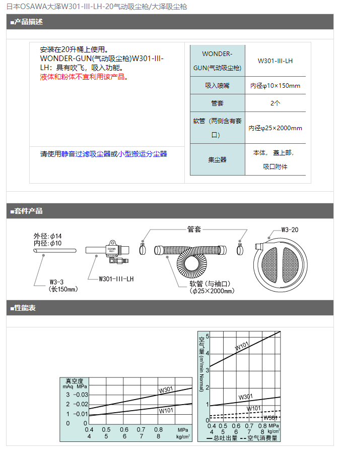 日本OSAWA大澤W301-III-LH-20氣動吸塵槍