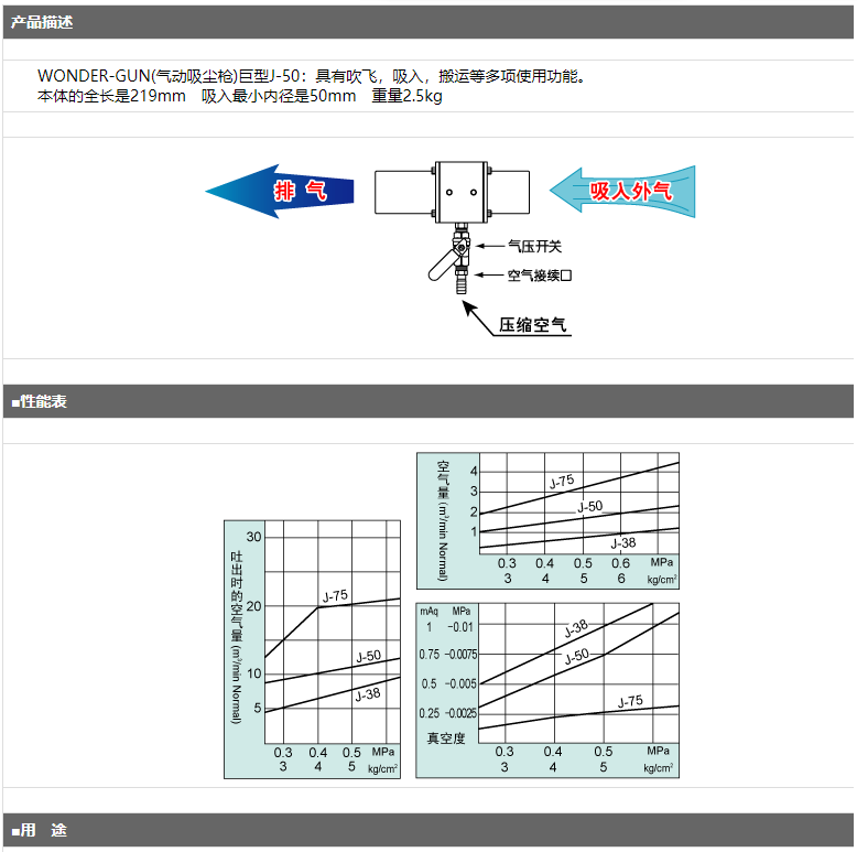 產(chǎn)品簡介: WONDER-GUN(氣動吸塵槍)巨型J-50:具有吹飛,吸入,搬運等多項使用功能。 本體的全長是219mm 吸入最小內(nèi)徑是50mm 重量2.5kg
