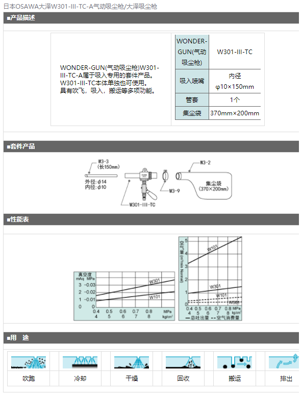 日本OSAWA大澤W301-III-TC-A氣動(dòng)吸塵槍