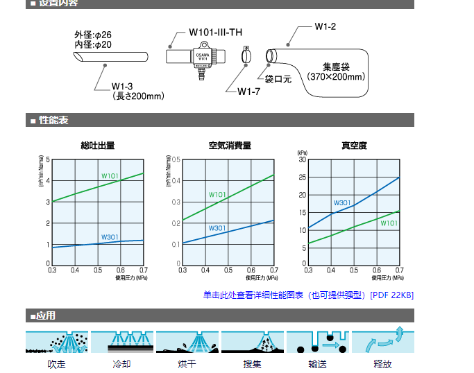 大澤W101-III-TH-A 是吸力套裝。W101-III-TH主機(jī)也可以單獨(dú)使用。請(qǐng)用它來(lái)吹、吸、運(yùn)。尤其是螺旋噴射式產(chǎn)品,有效利用壓縮空氣作為動(dòng)力源,槍內(nèi)完全呈圓柱形,無(wú)障礙物,完全不用擔(dān)心吸運(yùn)過(guò)程中有物體堵塞內(nèi)部。通過(guò)改變吸嘴的方向,可以在吹氣和吸氣之間切換,可用于輸送、收集、冷卻、排氣等。產(chǎn)品系列的小內(nèi)徑為 2.8mm 至 75mm。
