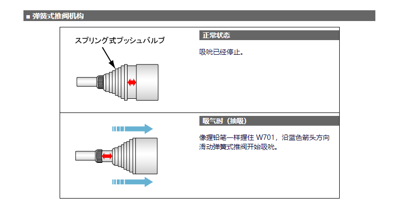 產(chǎn)品簡(jiǎn)介: W701 鉛筆型是一款使用壓縮空氣的緊湊型除塵器。它超小,非常適合您的手。 它可以輕松夾起球體等難以抓取的物體,也可以代替鑷子使用。 由于使用低壓空氣,任何人都可以安全、輕松地使用,并且使用的空氣量少。主體內(nèi)部為圓筒體,無(wú)障礙物,吸取或輸送時(shí)無(wú)需擔(dān)心被吸料堵塞內(nèi)部。