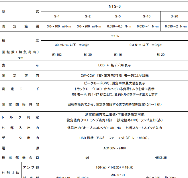 3種測量模式可設置上下限值,通過燈判斷通過/失敗5種類型以適應各種扭矩范圍OK/NG輸出數(shù)據(jù)輸出usb形狀外部啟動信號輸入通過實時輸出輕松創(chuàng)建扭矩波形NTS-6系列包括NTS-6/S-1、NTS-6/S-2、NTS-6/S-5、NTS-6/S-10和NTS-6/S-20。