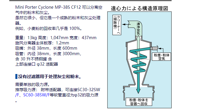 Mini Porter Cyclone MP-38S CF12 可以分離空氣中的粉末和灰塵。雖然它很小,但它是一個(gè)成熟的粉末和灰塵處理器。例如,小麥粉的回收率幾乎是 。重量:13kg 高度:1,047mm 寬度:437mm旋風(fēng)分離器主體板厚:1.2mm吸嘴:外徑 38mm,長(zhǎng)度 600mm