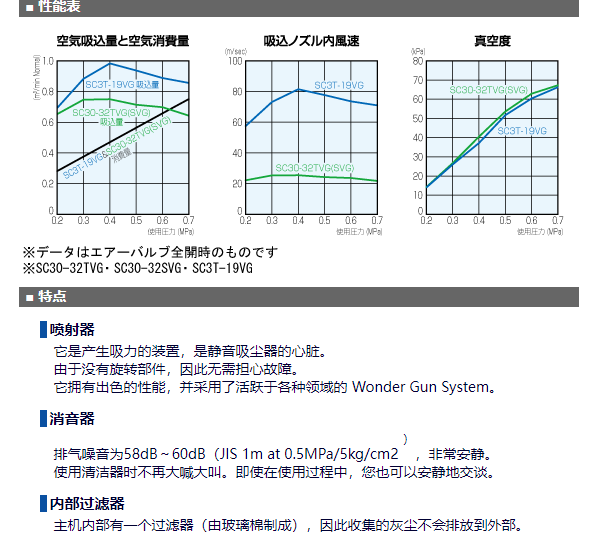Silent Cleaner SC30-32TVG可以吸入壓縮空氣(compressor air)作為驅(qū)動源。強力收集傳統(tǒng)工業(yè)清潔劑無法充分收集的高粘度油脂、污泥等。非常適合任何工作場所。2級結(jié)構(gòu)/多重過濾器!長時間連續(xù)使用OK!吸力強、降噪的吸塵器。重量:13kg 高度:890mm寬度:450mm吸嘴:外徑:32mm 長度:600mm吸管:內(nèi)徑:32mm,長度:2000mm25升帶腳輪透明罐。