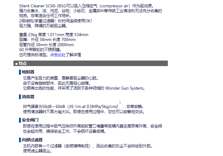 Silent Cleaner SC60-38SG可以吸入壓縮空氣(compressor air)作為驅(qū)動(dòng)源。強(qiáng)力收集水、油、污泥、谷物、小礫石、金屬碎片等傳統(tǒng)工業(yè)清潔劑無(wú)法充分收集的物質(zhì)。非常適合任何工作場(chǎng)所。2級(jí)結(jié)構(gòu)/多重過(guò)濾器!長(zhǎng)時(shí)間連續(xù)使用OK!吸力強(qiáng)、降噪的萬(wàn)能吸塵器。