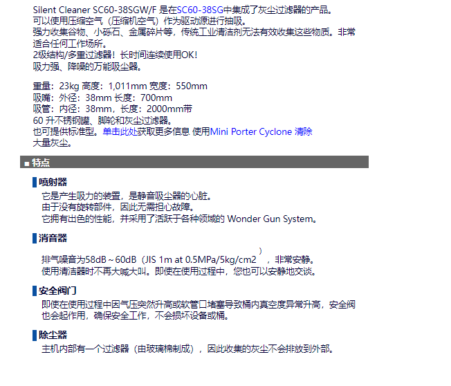Silent Cleaner SC60-38SGW/F 是在SC60-38SG中集成了灰塵過濾器的產(chǎn)品??梢允褂脡嚎s空氣(壓縮機(jī)空氣)作為驅(qū)動(dòng)源進(jìn)行抽吸。強(qiáng)力收集谷物、小礫石、金屬碎片等,傳統(tǒng)工業(yè)清潔劑無法有效收集這些物質(zhì)。非常適合任何工作場(chǎng)所。2級(jí)結(jié)構(gòu)/多重過濾器!長時(shí)間續(xù)使用OK!吸力強(qiáng)、降噪的吸塵器。重量:23kg 高度:1,011mm 寬度:550mm