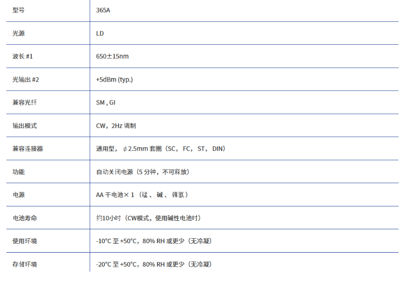 端口 850/1310nm 雙輸出觸控調(diào)制開關(guān) (CW/2kHz/1kHz/270Hz)輕巧緊湊(名片尺寸)個 AA 干電池可長時間連續(xù)運行