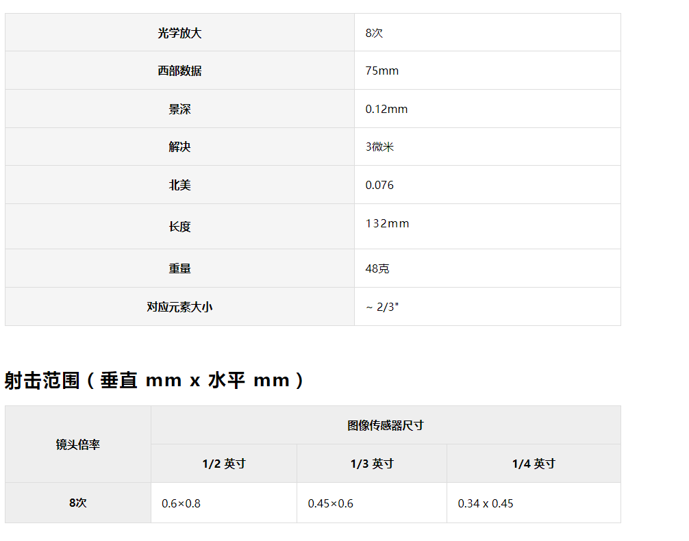 光學(xué)放大 8次,西部數(shù)據(jù) 75mm,景深 0.12mm解決 3微米,北美 0.076,長度 132mm,重量 48克對應(yīng)元素大小 ~ 2/3"
