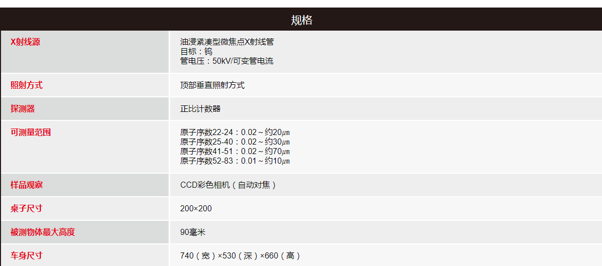 照射方式頂部垂直照射方式探測器正比計數(shù)器可測量范圍原子序數(shù)22-24:0.02~約20?原子序數(shù)25-40:0.02~約30?原子序數(shù)41-51:0.02~約70?原子序數(shù)52-83:0.01~約10?樣品觀察CD彩色相機(自動對焦)桌子尺寸200×200被測物體高度90毫米