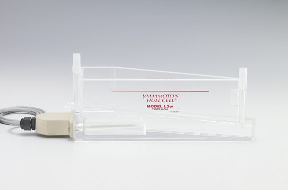 通過將陰極板制作得比普通赫爾電池長兩倍(200mm),低電流區(qū)域更容易看到。底部可內(nèi)置加熱器以進(jìn)行空氣攪拌。這種類型的赫爾槽非常適合滾鍍和合金電鍍。長型赫爾槽由“Dip Sole Co., Ltd.”設(shè)計,由本公司設(shè)計。