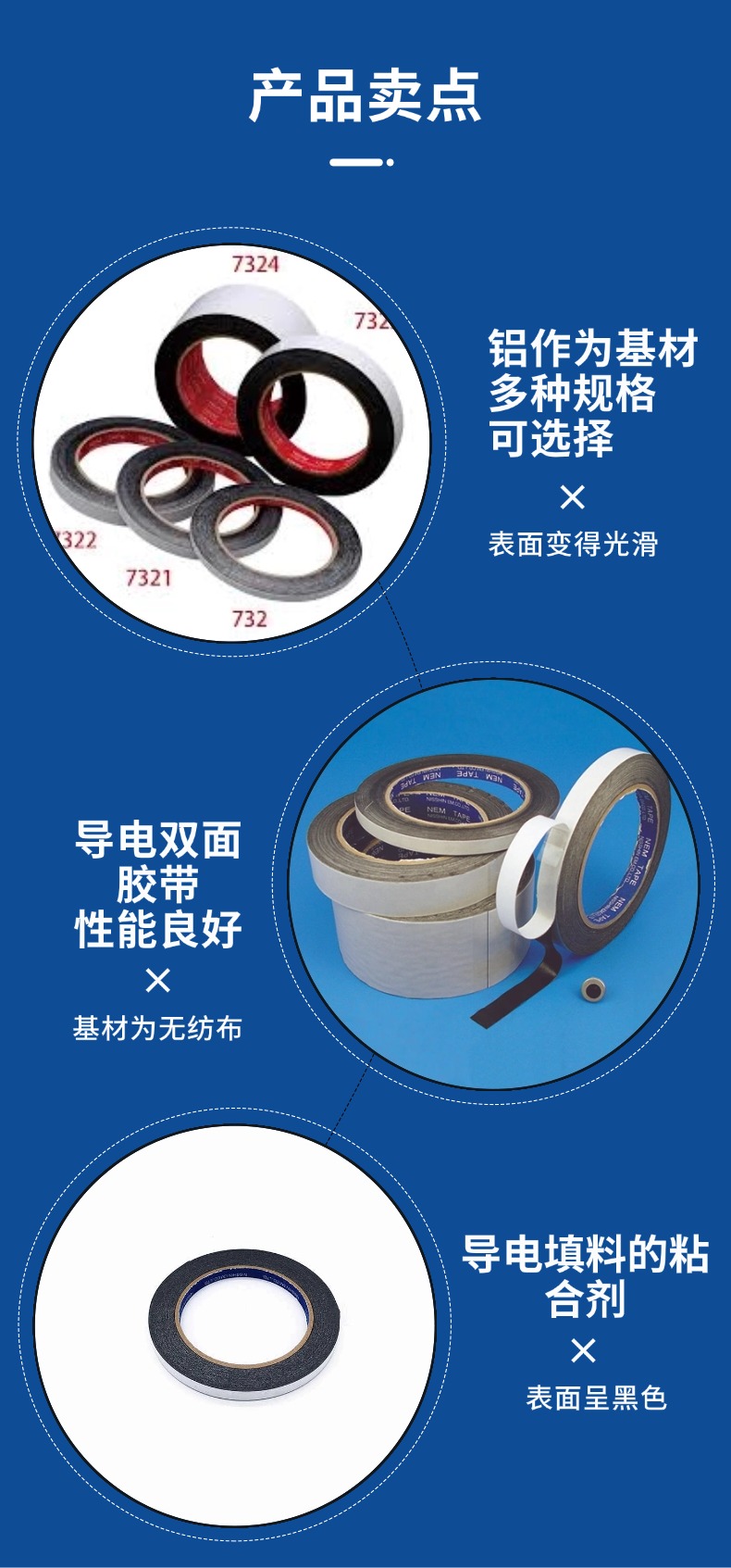 用于密封EMI屏蔽室,殼體和電子設備的接縫,纏繞電纜進行屏蔽,提供可靠的接地表面,對不能焊接的表面提供電接觸,日新雙面碳導電膠帶是專門為掃描電鏡具有良好的黏附性和不可辨結構,是觀測整個樣本的理想背景基片。