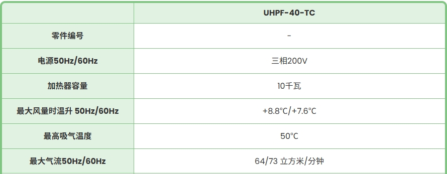 產(chǎn)品簡介: UHPF-40-TC 電源50Hz/60Hz 三相200V 加熱器容量 10千瓦 最大風(fēng)量時(shí)溫升 50Hz/60Hz +8.8℃/+7.6℃ 最高吸氣溫度 50℃ 最大氣流50Hz/60Hz 64/73 立方米/分鐘